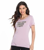 Blusa Feminina desenvolvida em Malha Tricot. Modelagem T-Shirt, com mangas curtas e gola redonda. Possui estampa localizada com frase em inglês. Tradução: ""Mantenha seus sonhos vivos"". Peça básica e confortável, ideal para o dia a dia! Combine com: jeans e tênis.