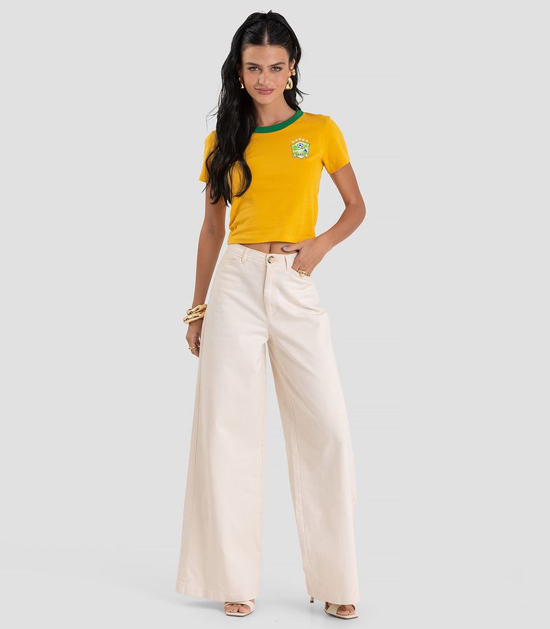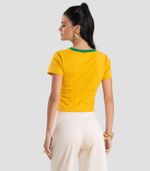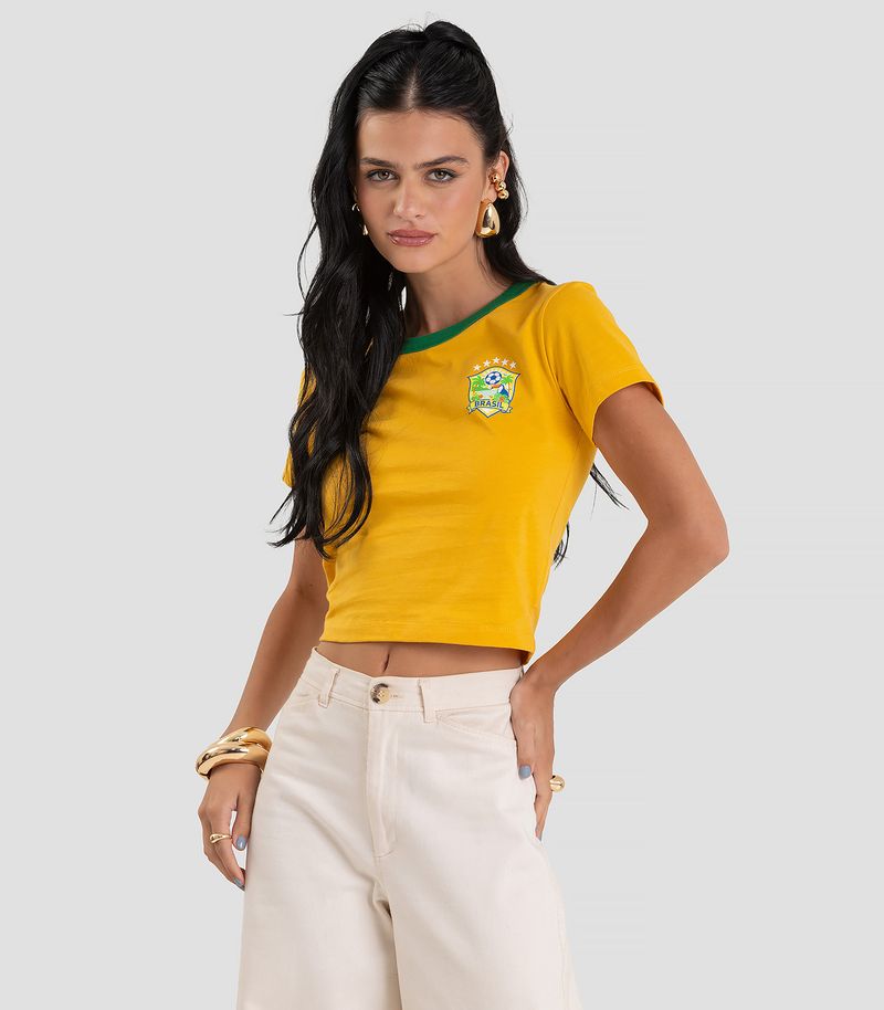Blusa Feminina Dianna, desenvolvida em Cotton Leve. Possui decote em ribana contrastante, manga curta, modelagem ajustada e comprimento levemente curto, que valoriza a silhueta com conforto. Conta com estampa localizada com tema Brasil, trazendo um toque especial e cheio de personalidade. Moderna e despojada, é a escolha perfeita para entrar no clima da Copa, torcer pela seleção com muito estilo e demonstrar todo o orgulho pelo Brasil