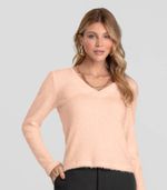 Blusa Feminina Manga Longa Dianna, confeccionada em malha tricot felpudo de toque macio e agradável. Possui base lisa e decote em V com revel entretelado e delicado pesponto, conferindo acabamento refinado à peça. As mangas longas e o comprimento apresentam bainha precisa, garantindo caimento impecável. Uma blusa versátil e elegante, ideal para compor produções casuais com sutileza e sofisticação, aliando conforto, praticidade e estilo.
