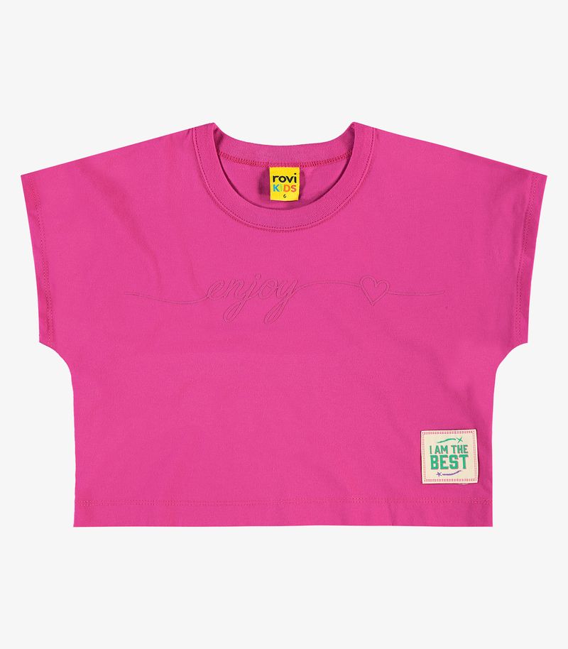 Camiseta feminina confeccionada em meia malha moletom, oferecendo conforto e estilo. Possui gola em ribana contrastante, estampa localizada delicada no peito e aplicação termocolante na parte inferior da peça. As mangas têm acabamento com bainha dupla estreita, e a barra conta com bainha mais larga e reforçada. Ideal para looks modernos e casuais, unindo praticidade e charme no dia a dia.