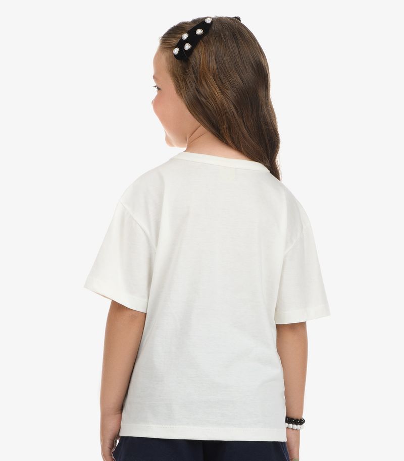Blusa Feminina Rovi Kids, confeccionada em meia malha de toque agradável. Traz base lisa com estampa localizada com strass no centro da peça, decote redondo em retilínea com reforço em friso nas costas, além de mangas e barra com acabamento em babado para caimento impecável. Conta ainda com etiqueta interna nas costas. Uma peça versátil e refinada, ideal para compor looks casuais com elegância e sofisticação.