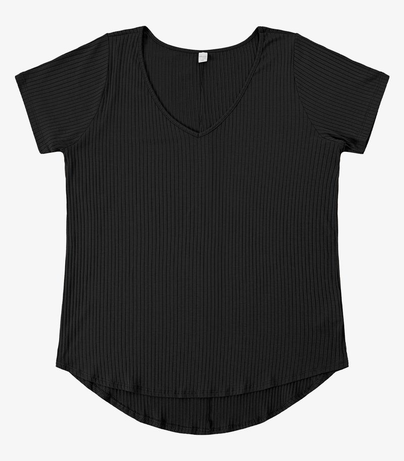 A Blusa Plus Size da Infinita Cor é confeccionada em Malha Ribana Canelada, um tecido que proporciona um ajuste confortável e elegante. Esta blusa possui um decote em V, que alonga e valoriza a silhueta. A parte das costas é alongada, oferecendo um caimento diferenciado e mais cobertura. Além disso, a barra arredondada adiciona um toque moderno e sofisticado ao design da peça
