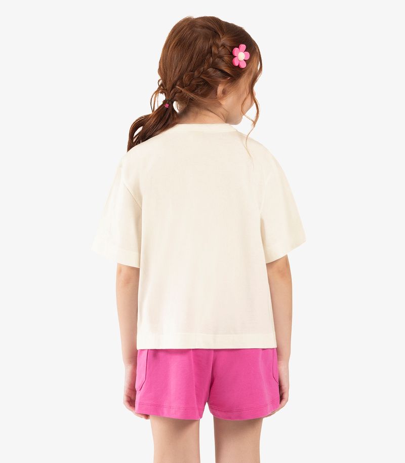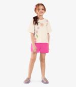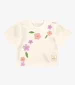 Blusa Feminina Infantil Rovitex Kids, confeccionada em Meia Malha macia e confortável, ideal para o dia a dia. Possui decote redondo com acabamento em ribana, cava deslocada e manga curta, garantindo caimento moderno e descontraído. Apresenta estampa localizada de flores com aplicação de termocolante em strass, que adiciona brilho e delicadeza à peça. Acabamento da barra em bainha, oferecendo um toque final de qualidade e estilo.