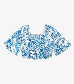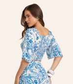 Blusa feminina Endless, confeccionada em sofisticada Viscose Khyara Acetinada. Em estilo cropped, apresenta decote quadrado com revel e recorte frontal, além de fita de sustentação para melhor ajuste. As mangas, com estampa digital, trazem delicados babados que conferem leveza e movimento, finalizadas com bainha para caimento perfeito. Na parte posterior, recorte com lastex garante conforto e acabamento refinado, enquanto plaquinha metálica valoriza o design.