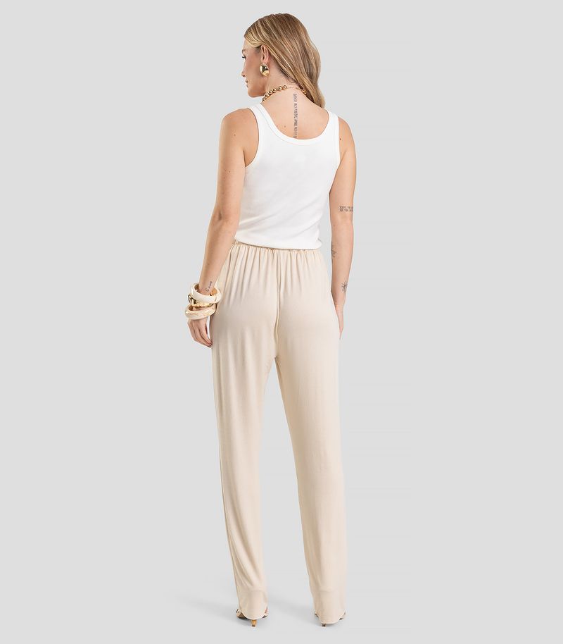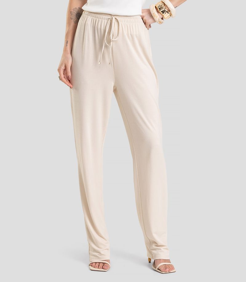 Calça Feminina Dianna, desenvolvida em Visco Maquinetada de toque suave e caimento elegante. Possui cós virado com elástico embutido, garantindo conforto e melhor ajuste ao corpo. Conta com caseados funcionais para passagem de cordão em friso, com acabamento em ponteiras para amarração frontal. Apresenta shape reto, que alonga a silhueta e proporciona um visual moderno e sofisticado, ideal para composições casuais ou elegantes.