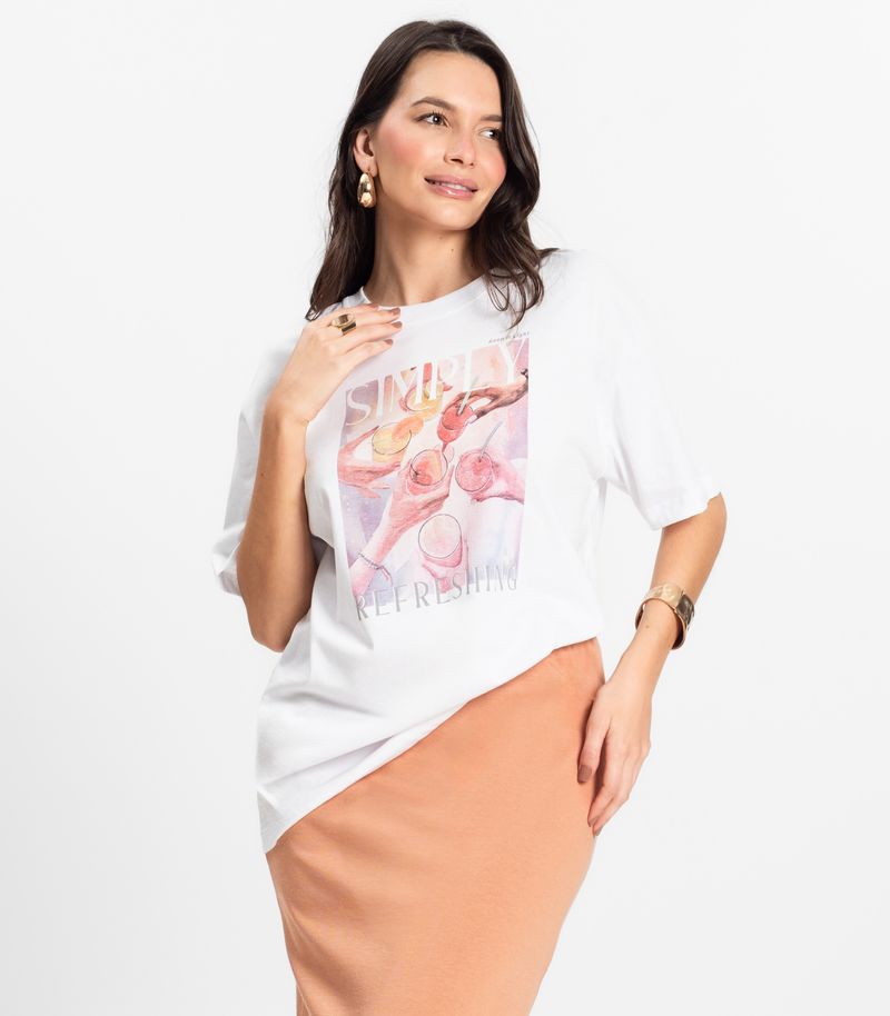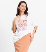 Camiseta feminina Rovitex confeccionada em meia malha, oferecendo conforto e leveza para o dia a dia. Modelo com caimento amplo estilo "over", possui gola com acabamento canelado e pesponto aparente. A peça conta com estampa localizada frontal, que traz um toque moderno e divertido. As mangas e a barra têm acabamento reforçado com costura dupla, garantindo durabilidade. Ideal para compor looks despojados e estilosos.