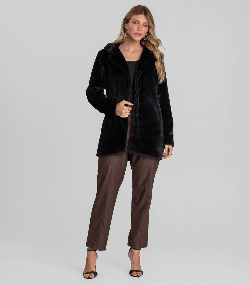 Casaco Feminino em Pelo Sintético Safira Dianna, confeccionado em malha de toque macio e aconchegante. Possui base lisa, gola dupla embutida no próprio tecido e peça inteiramente forrada, com recuo nas mangas e na barra para melhor acabamento e caimento. Apresenta dois caseados horizontais com botões funcionais, que agregam praticidade ao design. Ideal para compor looks elegantes em ocasiões formais ou casuais, unindo conforto, versatilidade e sofisticação.