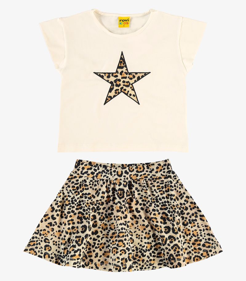 Conjunto infantil composto por blusa e saia, confeccionado em meia malha leve e confortável. A blusa possui manga dupla, cava reta e bordado com aplicação em forma de estrela, além de acabamento no decote com detalhe em ribana. A saia tem estampa rotativa delicada, cós com elástico de 40mm, leve franzido e shorts interno para maior segurança e praticidade. Ideal para o dia a dia, combinando estilo e liberdade para brincar.