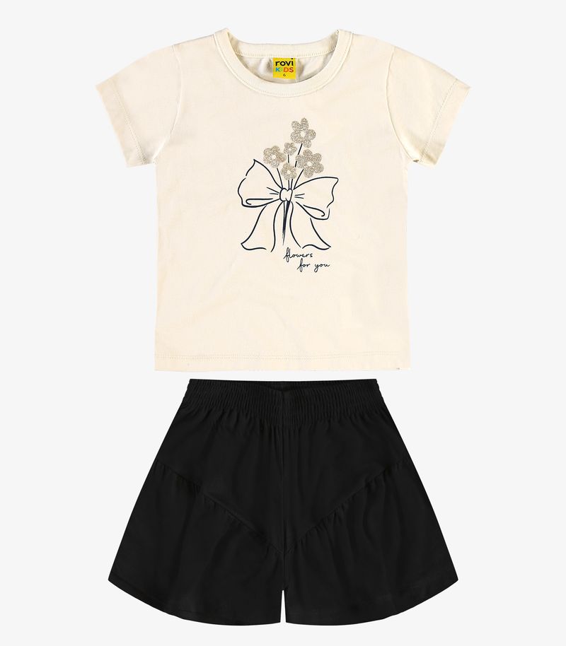 Conjunto infantil composto por blusa e shorts em Meia Malha Visco Maquinetada, tecido leve e confortável. A blusa tem estampa delicada de laço com flores, acabamento com costura dupla na barra e nas mangas, além de etiqueta nas costas. O shorts possui cós com elástico largo para ajuste ideal, recorte com detalhe franzido na barra que dá charme à peça, e acabamento reforçado. Um look fofo, prático e confortável para o dia a dia.