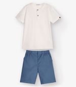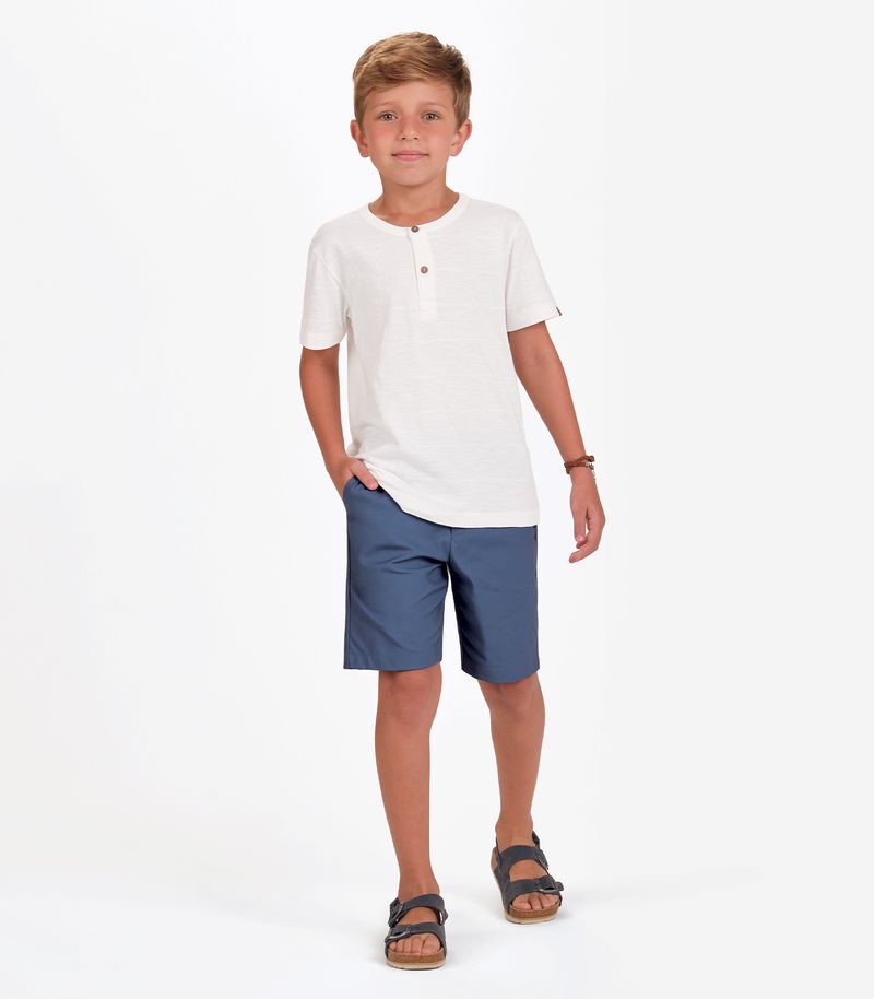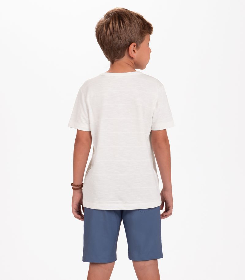 O Conjunto Camiseta com Bermuda Trick Nick é confeccionado em meia malha flame maquinetado e sarja twill, oferecendo leveza e conforto para o dia a dia. Possui base lisa com aplicação de botões e etiqueta decorativa na manga. Na bermuda, possui bolso nas laterais. O acabamento das barra é feita com costura dupla, garantindo mais resistência. O decote conta com reforço na