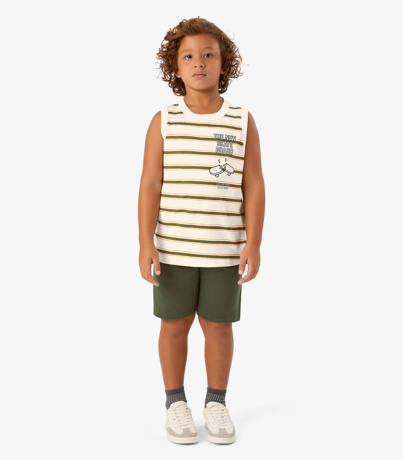 Conjunto infantil composto por regata e bermuda, confeccionado em meia malha moletom, ideal para dias quentes com muito conforto. A regata possui listras, estampa divertida com skate, decote e cavas com acabamento contrastante e costuras reforçadas. A bermuda tem cós com elástico largo que garante ajuste ideal e bainha com acabamento resistente. Modelo leve, prático e estiloso para acompanhar a rotina das crianças com liberdade de movimento.