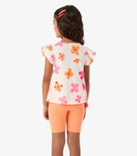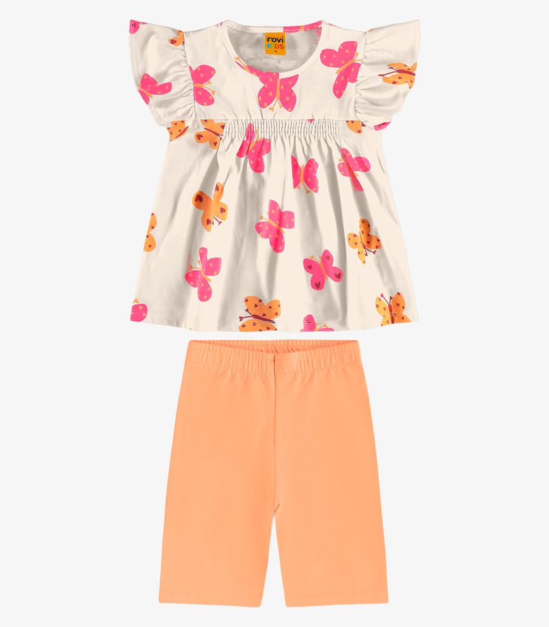 Conjunto infantil composto por regata e bermuda ciclista, confeccionado em meia malha cotton leve. A regata tem estampa rotativa de borboletas, babados franzidos nas mangas e detalhe franzido com lastex na parte frontal, trazendo charme e delicadeza. A barra tem acabamento com costura dupla. A bermuda ciclista tem cós com elástico embutido para maior conforto e acabamento com costura dupla na barra. Ideal para dias quentes e com muito estilo!