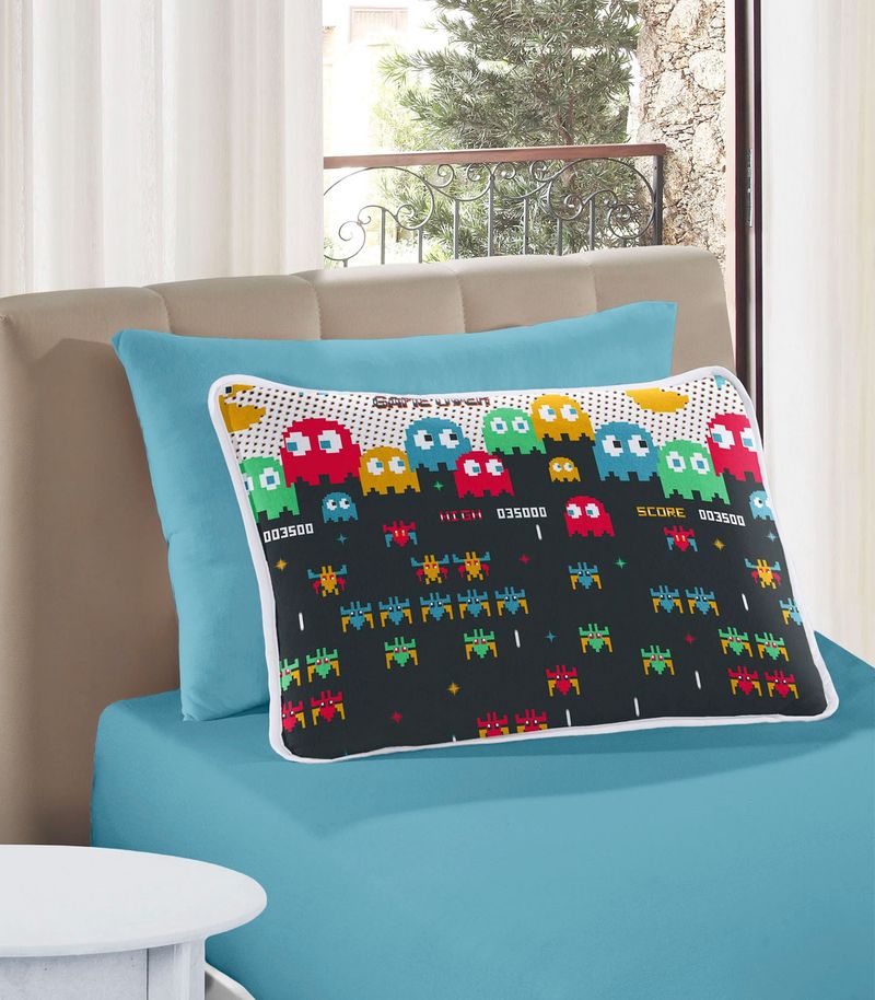 Jogo de Cama Casal Game On Inspirado nos jogos e na criançada, a estampa Game On traz elementos divertidos e joviais, que juntos nos fazem lembrar dos melhores games. Fabricado em malha 100% algodão com fio penteado 30/1 120g/m². Possui acabamento delicado, proporcionando harmonia, conforto e estilo para o quarto dos pequenos.