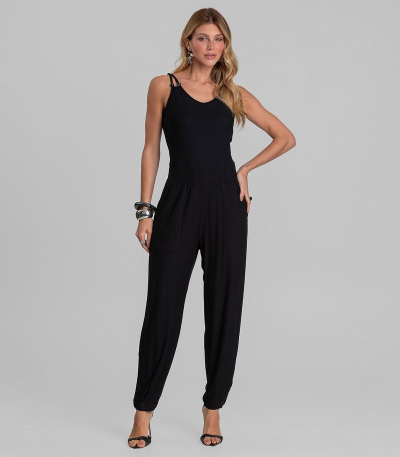 Macacão Feminino Decote em V Dianna, confeccionado em viscose creponada, que garante leveza, fluidez e elegância ao vestir. Possui base lisa e decote em V profundo, formando alças com aplicação de argolas metálicas, além de fita interna de sustentação para maior segurança. Conta com recorte com elástico para melhor ajuste ao corpo, bainha com acabamento limpo e bolso sobreposto aplicado na reta, com pesponto aparente e abertura com bainha. Uma peça versátil, ideal para compor looks sofisticados.