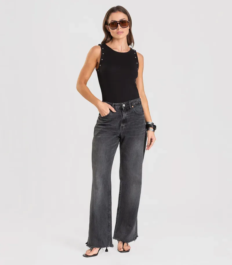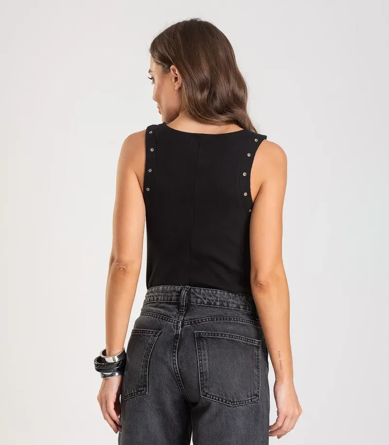 Regata Feminina Dianna, confeccionada em Ribana Canelada com Elastano, que proporciona maciez, elasticidade e ótimo caimento. Possui decote redondo clássico, cavas com revel entretelado e pesponto, garantindo acabamento durável e sofisticado, além de aplicação de ilhós na frente e costas, que adiciona charme e personalidade à peça. Com modelagem justa, valoriza a silhueta com conforto, sendo perfeita para compor looks casuais ou modernos em diversas ocasiões.
