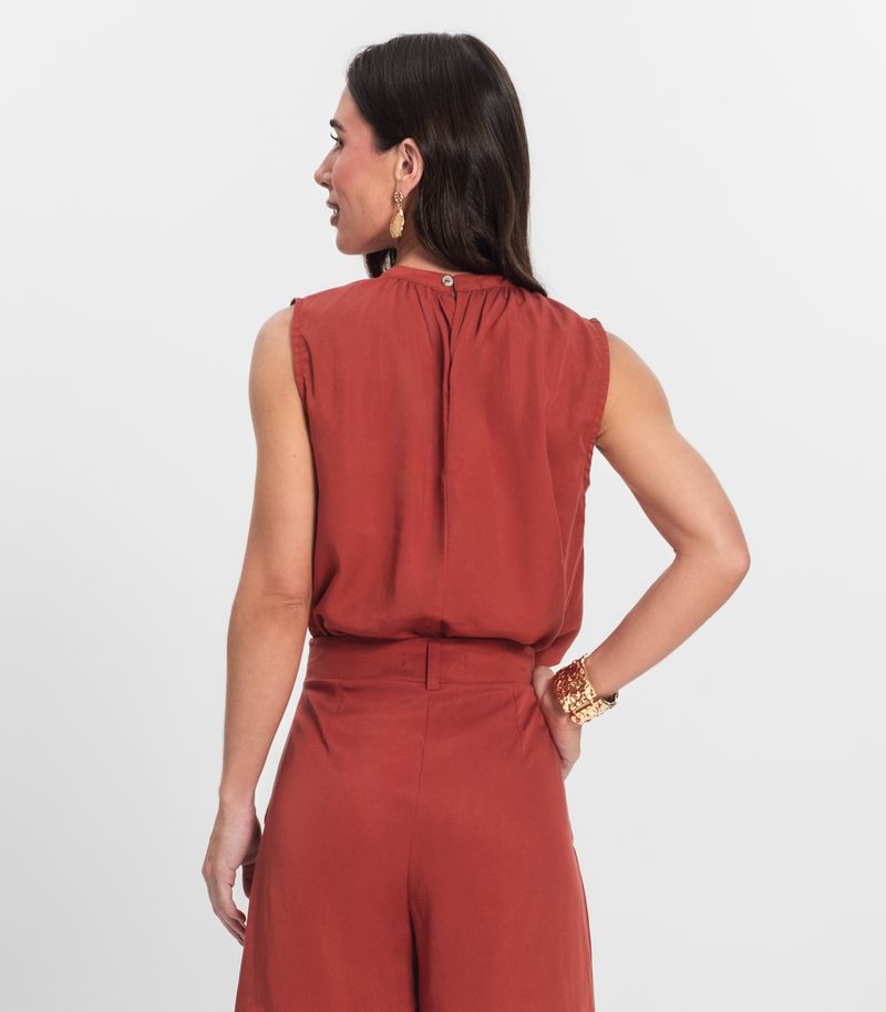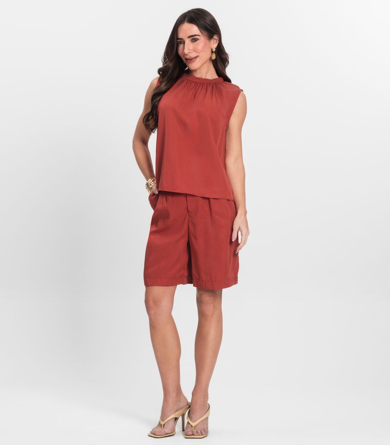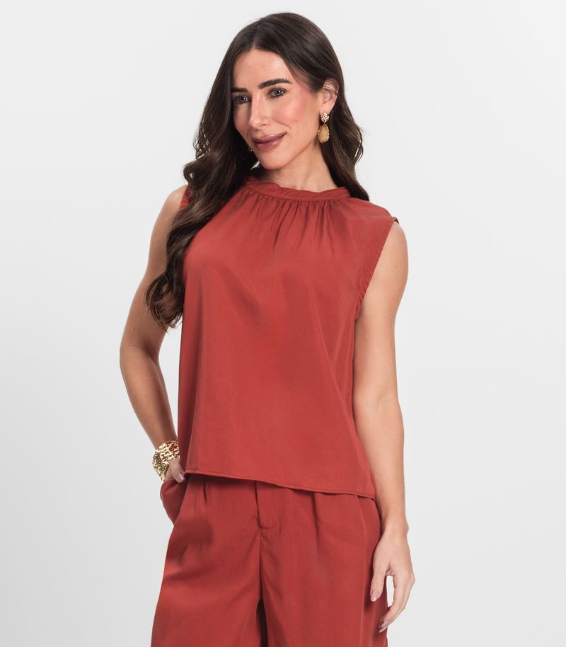 A Regata Feminina Curta com Gola Endless é confeccionada em tecido tencel twill, oferecendo toque macio e caimento leve. Possui golinha dupla franzida, que adiciona charme e sofisticação ao visual. Com mangas cavadas, é ideal para dias mais quentes, garantindo frescor e estilo. A pequena abertura nas costas com fechamento por um botão traz um detalhe delicado e funcional. Perfeita para compor looks casuais ou elegantes com um toque feminino.