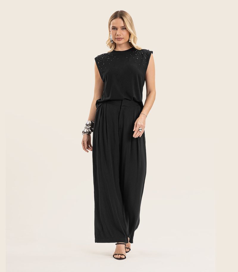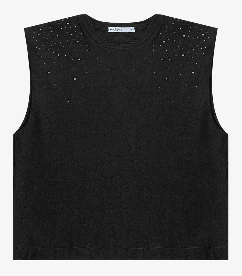 Regata Feminina Endless confeccionada em viscose creponada com gola em ribana de viscose, unindo conforto e sofisticação. O destaque fica por conta da aplicação de rebites com strass na parte superior, que trazem brilho e estilo ao visual. Possui acabamento interno bem-feito, garantindo durabilidade e melhor caimento. A barra tem costura dupla, proporcionando um toque moderno e firme à peça. Ideal para compor looks casuais com charme.