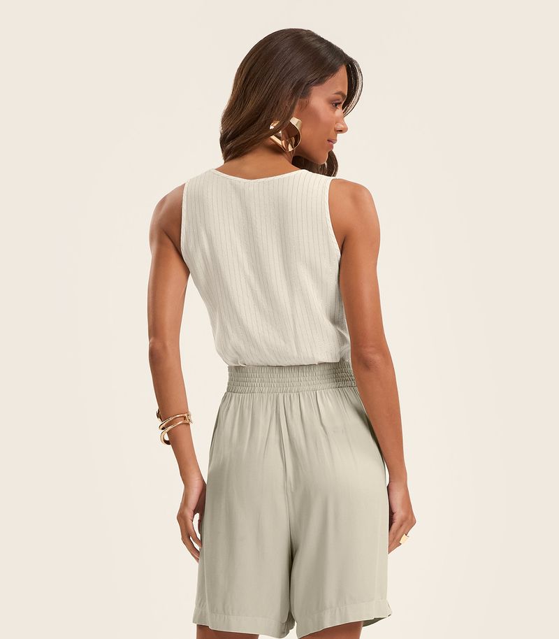 Regata feminina confeccionada em tecido Listarda Lurex, ideal para looks leves e estilosos. Possui decote em "V" com acabamento em friso, o mesmo utilizado nas cavas, garantindo um toque sofisticado e bem-acabado. A parte de trás tem decote reto e aplicação de etiqueta interna. A barra é finalizada com bainha estilo lenço, com costura delicada, que proporciona um caimento elegante e confortável ao vestir.