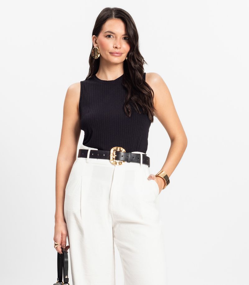 A regata confeccionada em ribana canelada é uma peça confortável e elegante. Com seu tecido macio e maleável, ela se ajusta perfeitamente ao corpo, valorizando a silhueta. A plaquinha de metal, um detalhe sofisticado, adiciona um toque de glamour à peça. Versátil, a regata pode ser combinada com diversas peças, desde calças jeans até saias mais sofisticadas, e é ideal para diversas ocasiões, desde um passeio no parque até um jantar elegante.