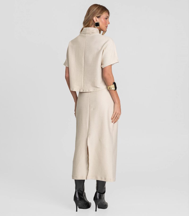 A Saia Midi Dianna une sofisticação e bem-estar em uma peça única. Confeccionada em moletinho gorgurinho, o tecido texturizado confere um visual moderno e estruturado, sem perder o toque macio. O modelo possui elástico na cintura para um ajuste perfeito ao corpo e fenda na parte de trás, que garante liberdade de movimento e um toque de sensualidade discreta. Com comprimento midi, é a escolha ideal para looks versáteis, transitando facilmente entre o estilo casual e o office look refinado.