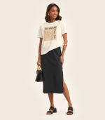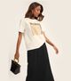 T-shirt feminina confeccionada em meia malha, com toque macio e ótimo caimento. Possui modelagem reta, decote arredondado com acabamento em friso e mangas curtas. A peça conta com estampa frontal moderna e aplicação de strass que dá um charme extra ao visual. As mangas e a barra possuem costura reforçada com acabamento duplo, garantindo durabilidade e estilo. Ideal para looks casuais com conforto e personalidade.