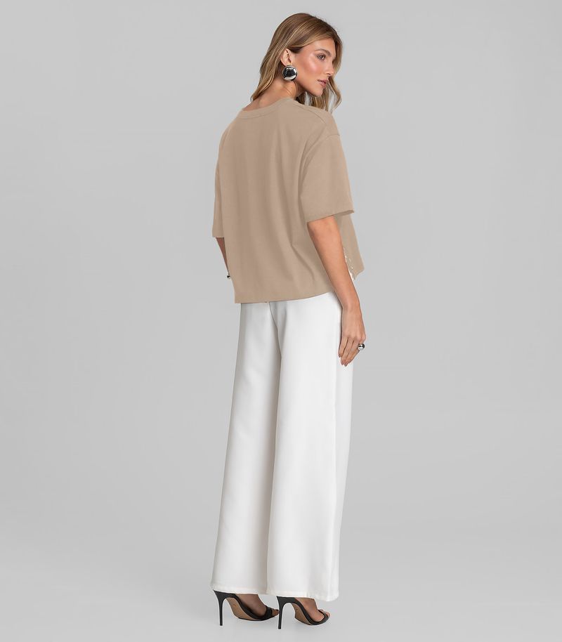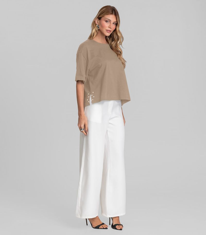 T-shirt Feminina Manga Curta Box Dianna, confeccionada em malha cotton leve, que proporciona toque macio e excelente conforto. Possui base lisa, decote redondo com friso e acabamento em bainha nas mangas e no comprimento. O grande destaque fica por conta das aberturas laterais adornadas com delicadas pedras, que agregam charme e sofisticação ao visual. Uma peça versátil e atemporal, ideal para compor looks elegantes ou casuais com praticidade e estilo.
