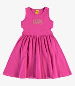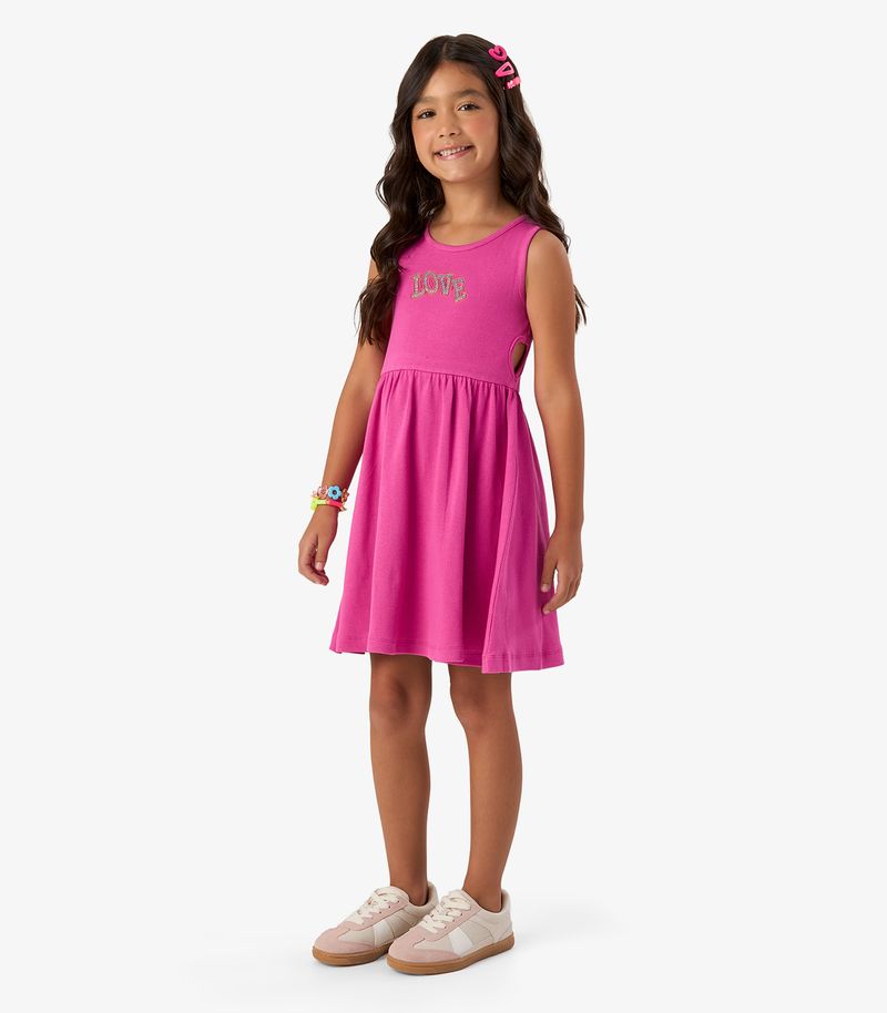 Vestido infantil confeccionado em ribana, tecido confortável e maleável. Possui decote e cavas com acabamento em friso, além de abertura nas laterais em formato de coração com o mesmo acabamento. A parte superior é decorada com patch termocolante com a palavra "LOVE". A cintura tem recorte franzido com elástico embutido, proporcionando melhor caimento. A barra tem acabamento com costura dupla e nas costas há etiqueta aplicada. Ideal para looks estilosos e divertidos.
