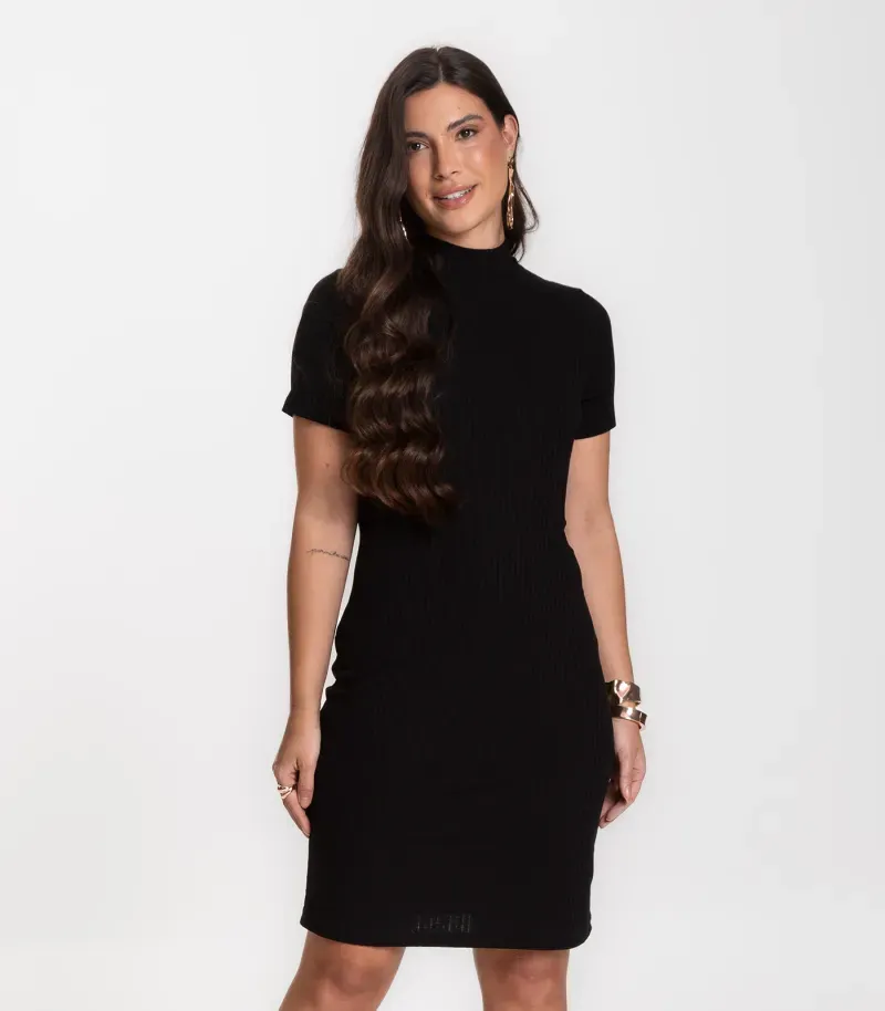 Vestido Feminino Infinita Cor, desenvolvido em malha de Ribana Canelada, que garante conforto e toque macio ao vestir. Possui gola dupla que valoriza o decote, manga curta e modelagem justa, destacando a silhueta com elegância. O comprimento acima do joelho traz um toque moderno e versátil, ideal para compor produções casuais ou mais sofisticadas, dependendo dos acessórios. Perfeito para quem busca estilo, praticidade e caimento impecável em uma única peça.