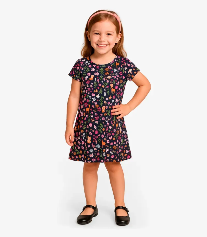 Vestido Feminino Infantil Select confeccionado em meia malha, proporcionando conforto e leveza. Possui decote redondo com acabamento em friso e mangas com bainha para melhor acabamento. Conta com estampa rotativa que traz charme à peça, além de caimento arredondado que valoriza o visual. O comprimento é finalizado com bainha, garantindo um acabamento delicado e ideal para o dia a dia.