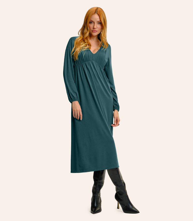 O vestido midi manga longa feminino é confeccionado em Visco Maquinetada, oferecendo leveza e conforto para o dia a dia. O acabamento das mangas é feito com costura dupla, garantindo mais resistência. O decote conta com reforço na parte de trás para maior durabilidade. Ideal para compor looks casuais com estilo e praticidade.