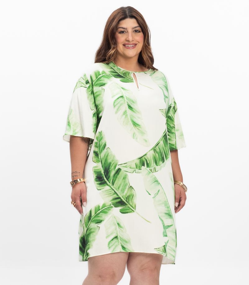 Vestido Feminino Plus Size Curto Secret Glam, confeccionado em viscose Khyara acetinada com estampa rotativa sofisticada. Apresenta decote levemente arredondado com falsa gota em friso e detalhe em V, além de mangas amplas em evasê com comprimento até o cotovelo, franzidas e finalizadas com bainha para caimento impecável. Barra com acabamento refinado. Peça perfeita para compor looks elegantes em ocasiões paradisíacas e momentos de charme descontraído.