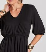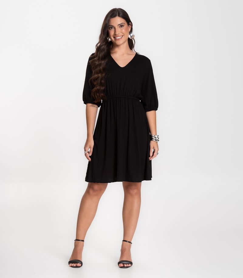 Vestido Feminino Select, confeccionado em visco maquinetado de toque suave e caimento elegante. Apresenta base lisa com decote em V arrematado por friso delicado, mangas até o cotovelo com elástico rebatido e cintura marcada pelo mesmo acabamento, proporcionando conforto e ajuste perfeito. O comprimento curto é finalizado com bainha precisa, garantindo um visual moderno e refinado.