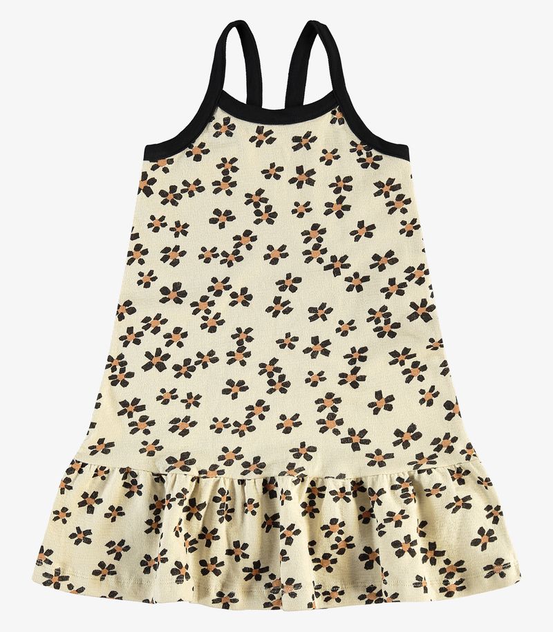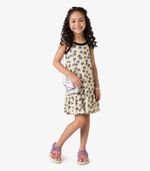 Vestido infantil confeccionado em Malhão Fruit, com alças em acabamento contrastante e costura reforçada. Possui estampa rotativa com flores, recorte franzido na barra que traz leveza e charme ao visual. A peça conta com acabamento de bainha dupla, etiqueta na lateral e modelagem confortável, ideal para os dias mais quentes. Um look prático, fresquinho e cheio de estilo para as pequenas.